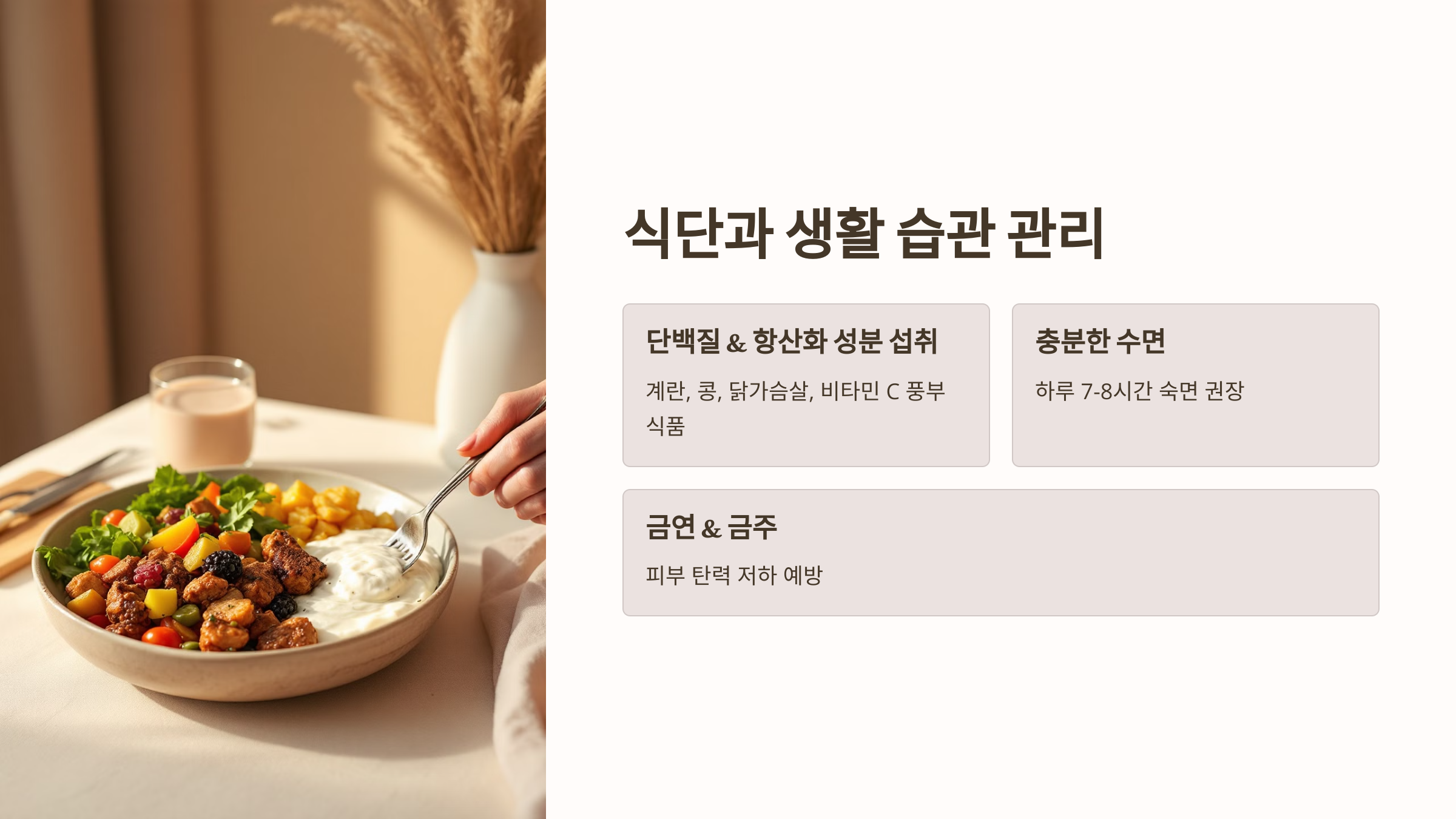 - 충분한 수면: 피부 재생은 밤 시간에 이루어지므로 적절한 수면 시간을 확보하는 것이 중요합니다. 하루 7~8시간의 숙면을 권장합니다.