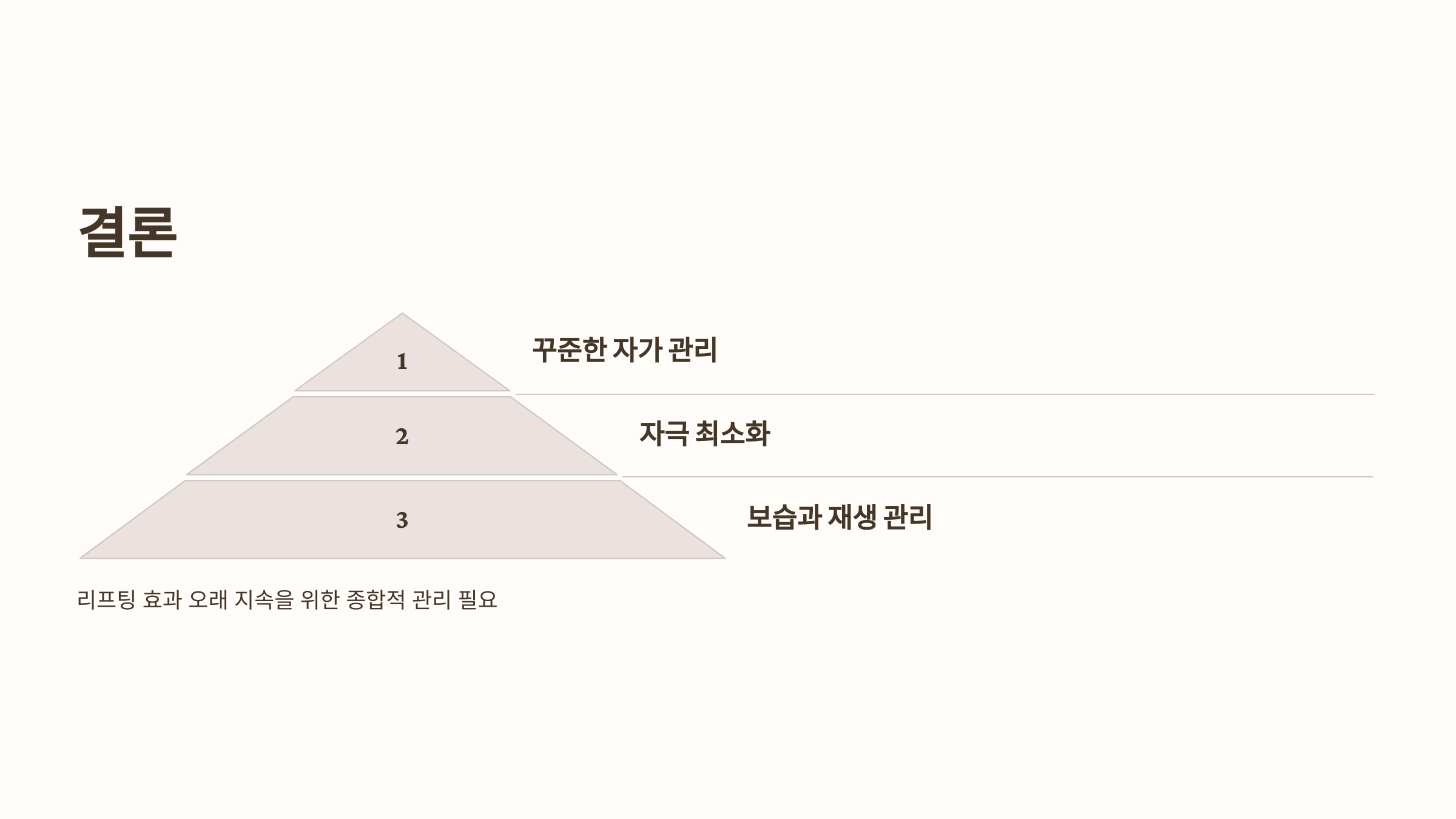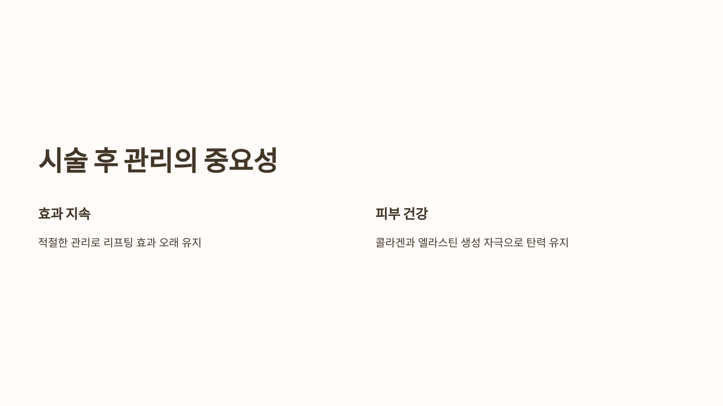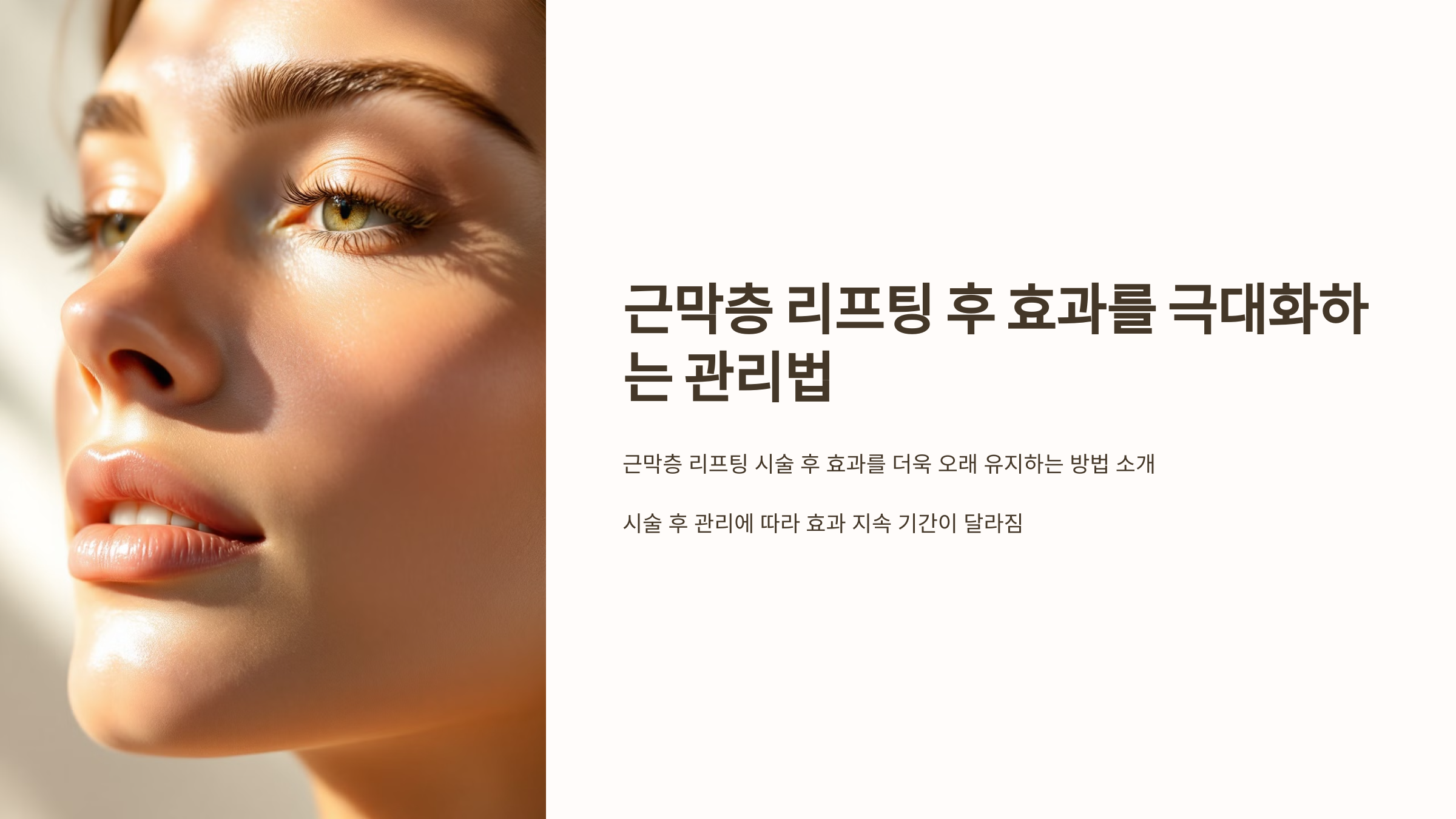 근막층 리프팅 시술 후 효과를 더욱 오래 유지하려면 시술 후의 관리가 매우 중요합니다. 특히 근막층(SMAS층)까지 도달하는 리프팅 시술은 콜라겐과 엘라스틴 생성을 자극하여 피부에 탄력을 부여하지만, 시술 후 관리에 따라 효과가 오래 지속될 수도, 반대로 빠르게 사라질 수도 있습니다. 이번 글에서는 근막층 리프팅 후 효과를 극대화하고, 피부 탄력을 더 오래 유지할 수 있는 관리법을 소개합니다.