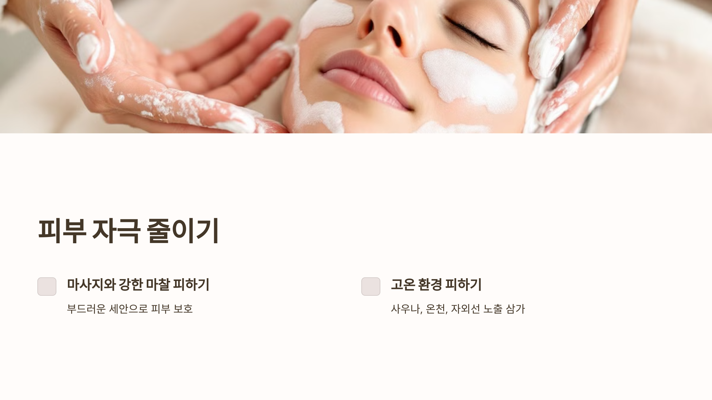 - 고온 환경 피하기: 뜨거운 사우나, 온천, 자외선 노출 등 고온 환경은 피부 자극을 유발하고, 콜라겐이 분해될 수 있으므로 최대한 피하는 것이 좋습니다.