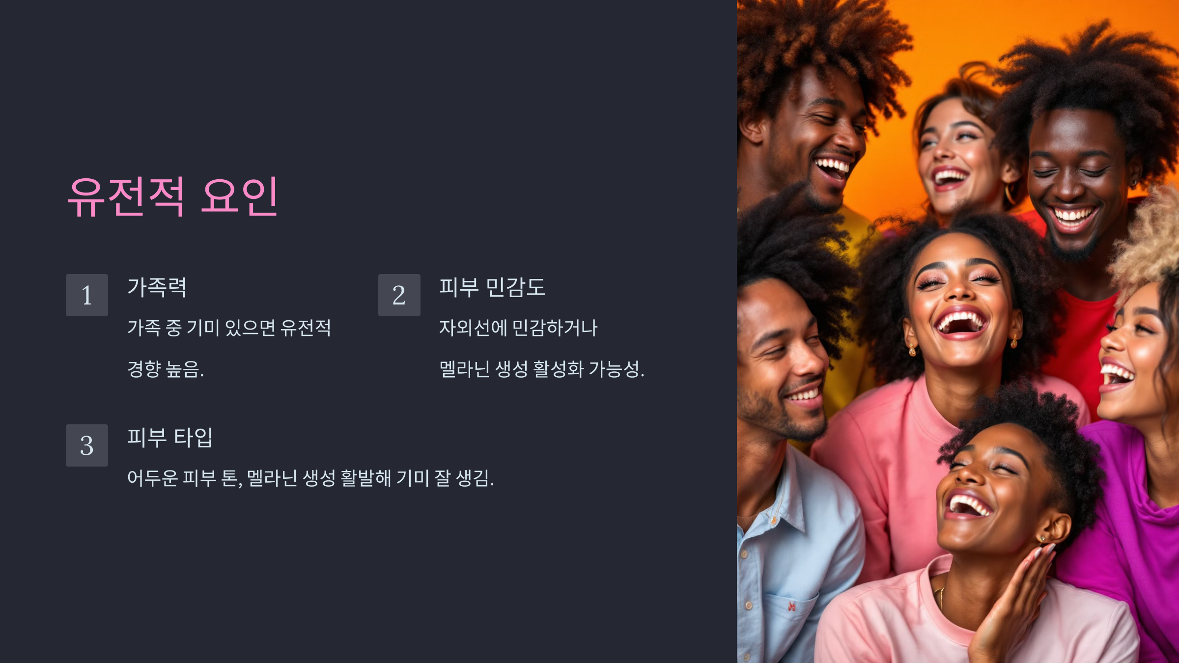 - 피부 타입: 특히 어두운 피부 톤을 가진 사람은 멜라닌 생성이 활발해 기미가 더 잘 생길 수 있습니다.