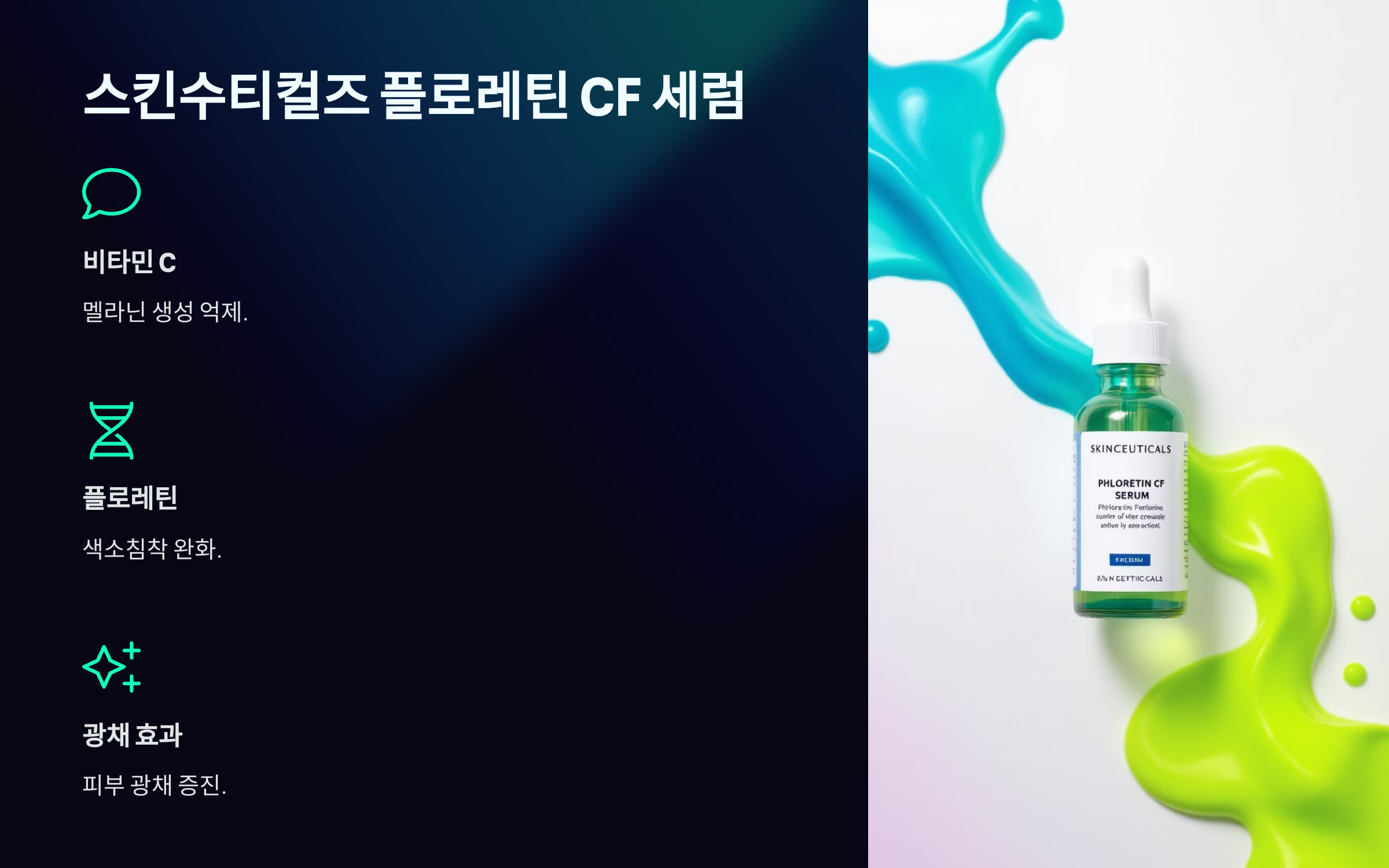 스킨수티컬즈의 플로레틴 CF 세럼은 비타민 C와 플로레틴 성분이 함유되어 있어 멜라닌 생성을 억제하고 색소침착을 완화하는 데 효과적입니다. 피부의 광채를 더하고 기미 예방에도 도움을 줍니다.