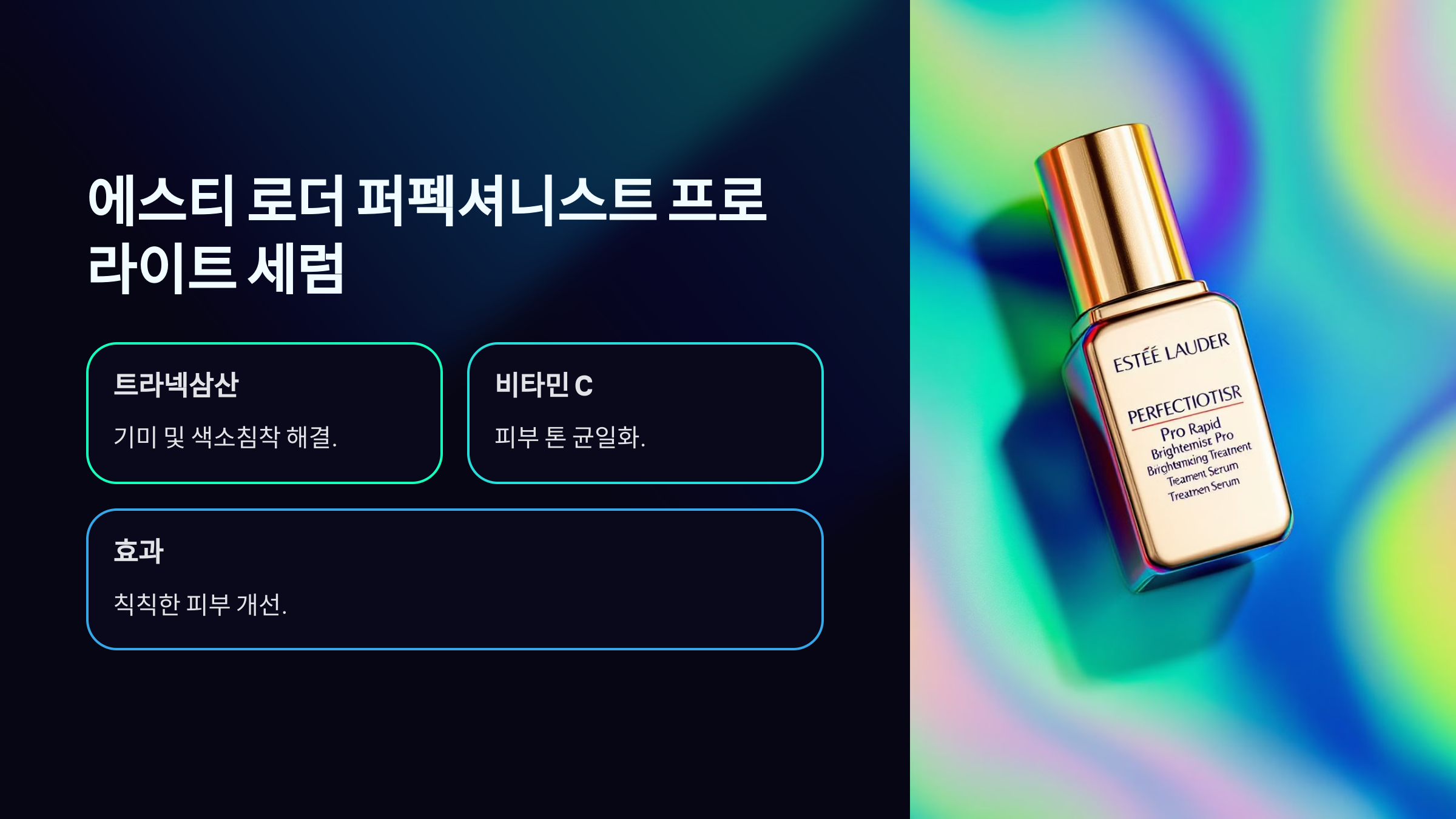 에스티 로더 세럼은 트라넥삼산과 비타민 C 성분으로 기미 및 색소침착 문제를 해결합니다. 피부 톤이 균일해지고, 칙칙한 피부가 개선됩니다.
