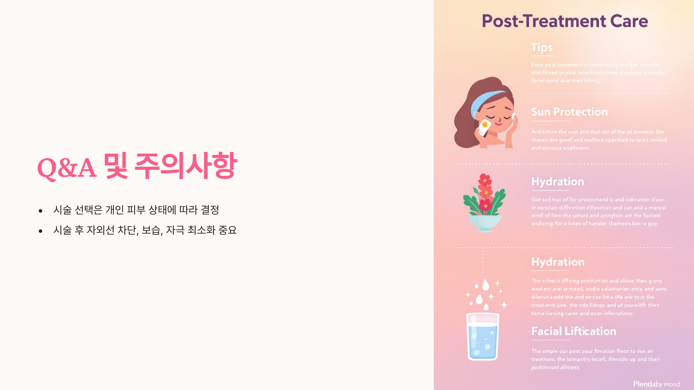 A5: 시술 후 자외선 차단, 보습, 자극 최소화가 중요합니다. 고온 환경, 사우나 등은 피하고 저자극 스킨케어 제품을 사용하는 것이 좋습니다.