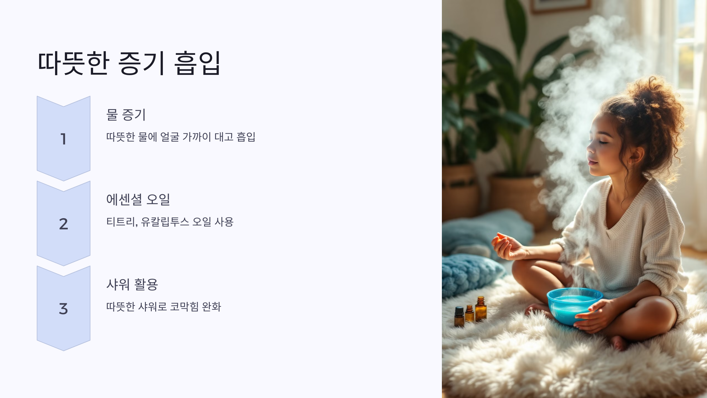 - 따뜻한 샤워: 샤워 중 발생하는 증기를 이용하여 코막힘을 완화할 수 있습니다.