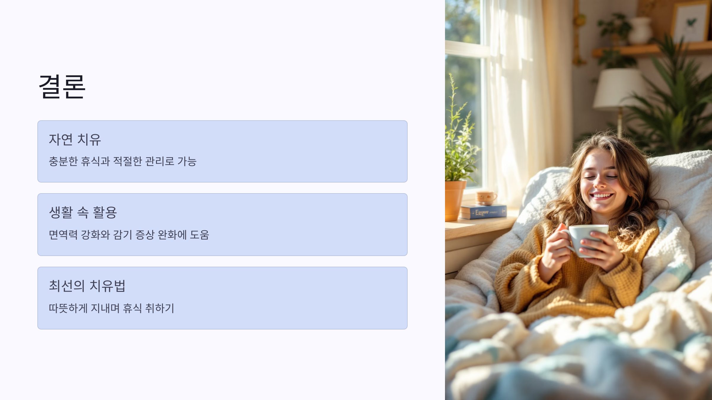 감기는 충분한 휴식과 적절한 관리로 자연 치유가 가능한 병입니다. 위의 방법들을 생활 속에서 활용해 면역력을 강화하고, 감기 증상을 완화하는 데 도움이 될 수 있습니다. 따뜻하게 지내며 휴식을 취하는 것이 최선의 치유법입니다!