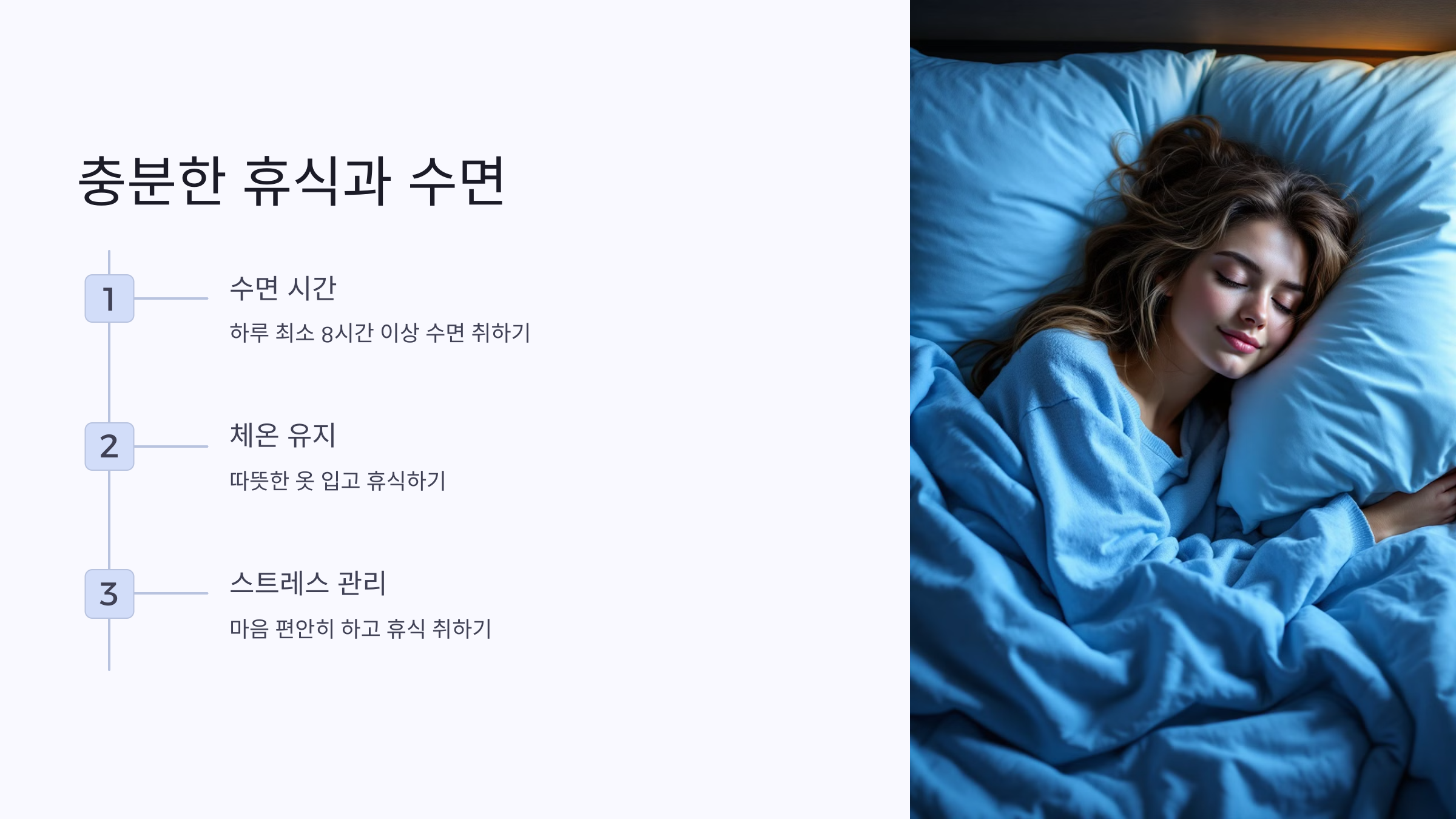 - 수면 시간 유지: 하루 최소 8시간 이상 자는 것이 좋습니다.