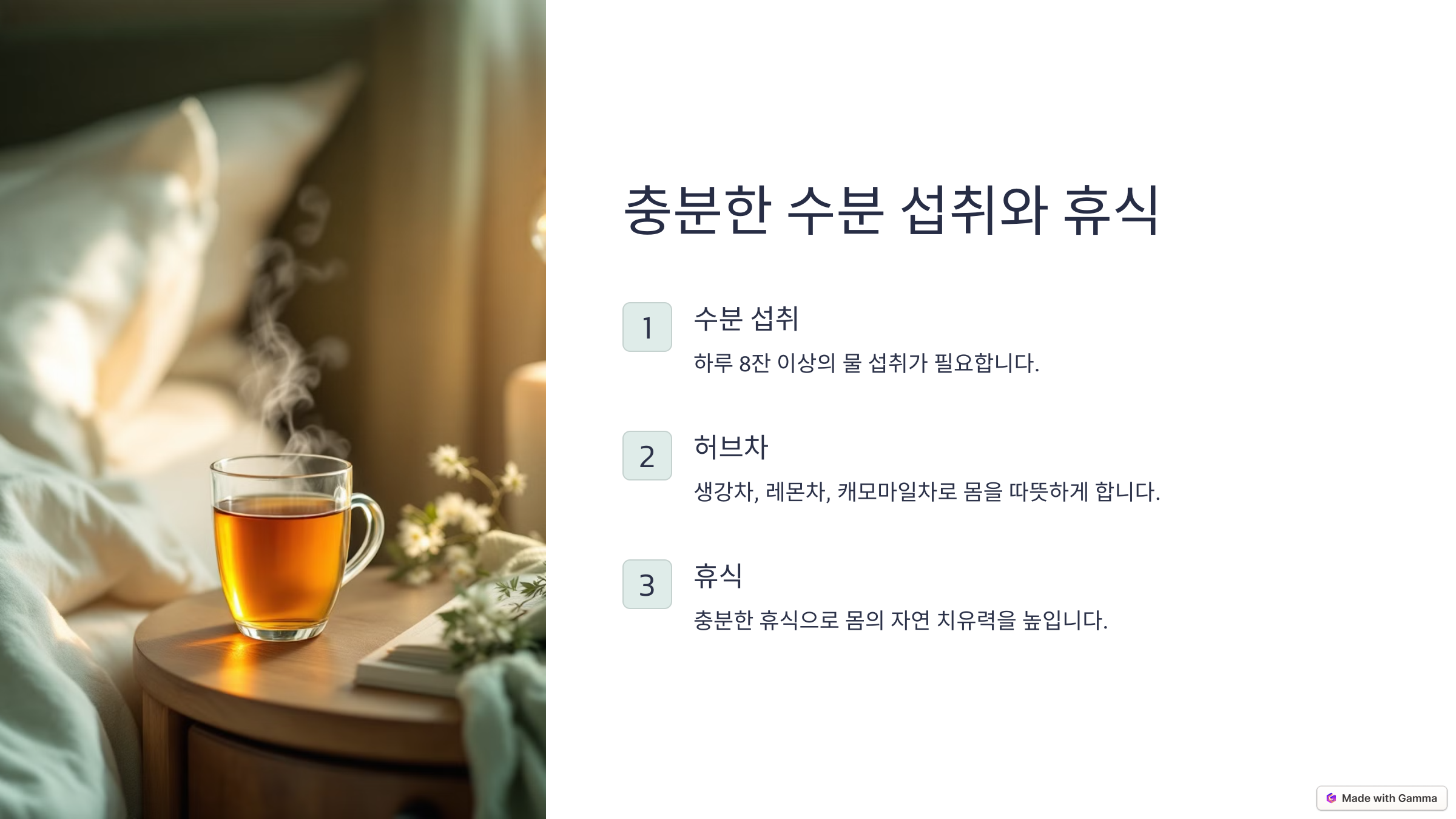 감기에 걸렸을 때는 몸속 수분을 충분히 유지하는 것이 중요합니다. 수분이 부족하면 목과 코가 더욱 건조해지며 기침과 가래가 심해질 수 있습니다. 물이나 따뜻한 허브차는 체온을 유지하면서 목을 촉촉하게 만들어 감기 증상 완화에 도움을 줍니다.