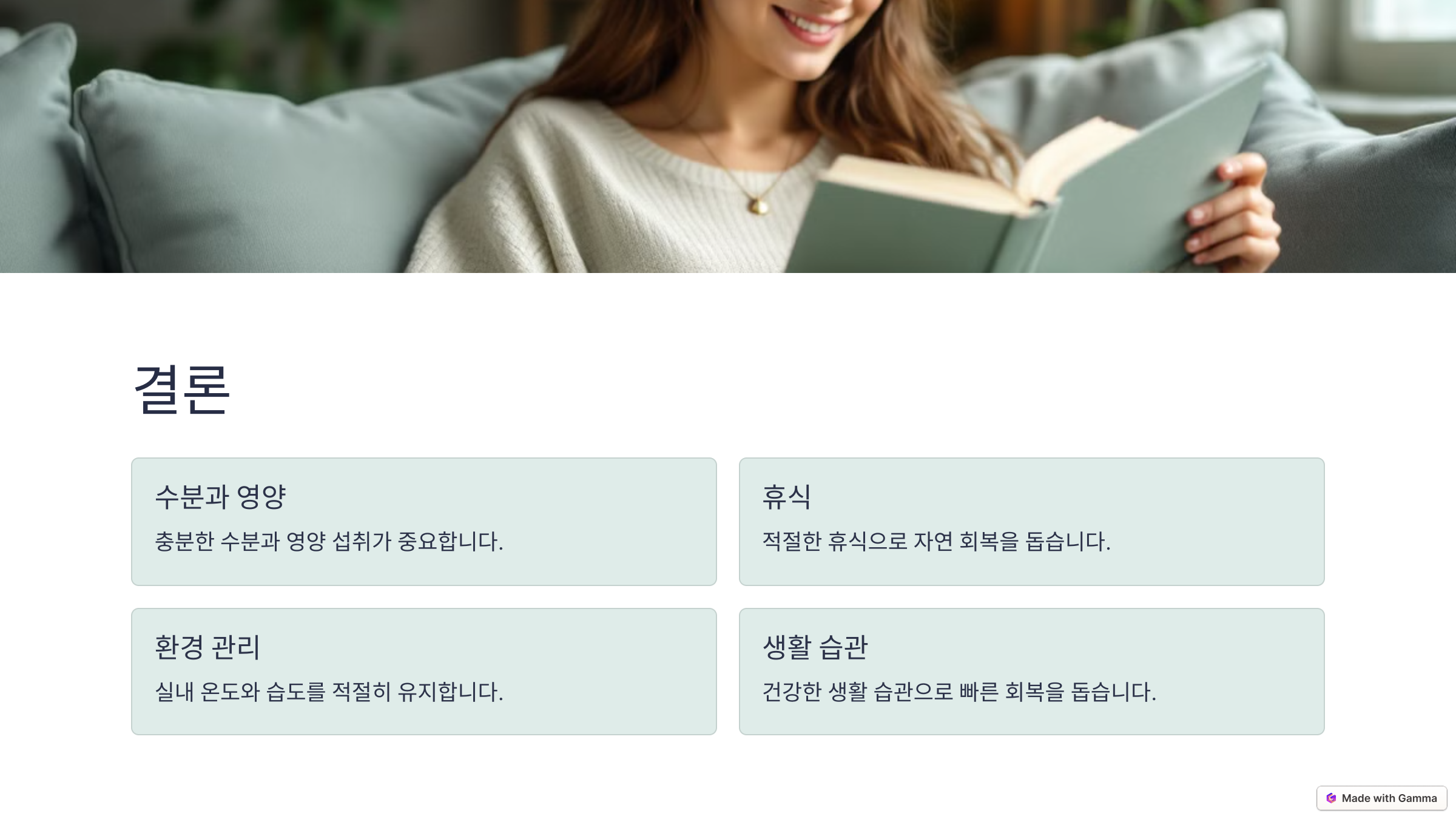 감기에는 휴식이 필요합니다. 몸이 스스로 치유하는 데에 필요한 시간을 주기 위해 충분히 쉬어야 합니다. 무리한 활동은 피하고, 잠을 충분히 자는 것이 증상 회복에 도움이 됩니다.