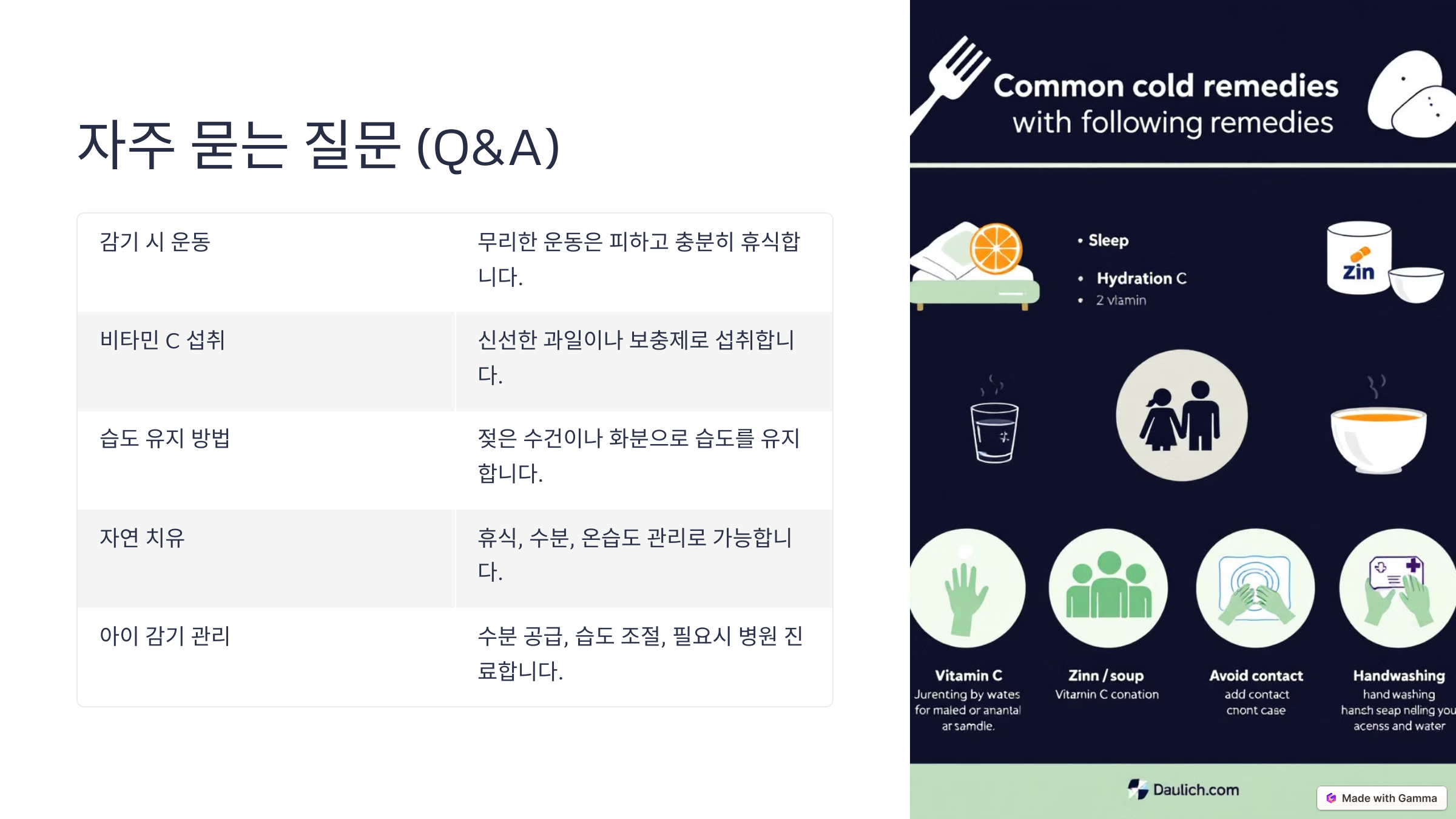 A4. 증상이 심하지 않다면 충분한 휴식, 수분 섭취, 온도와 습도 관리로도 자연 치유가 가능합니다. 하지만, 고열이 지속될 경우 전문의와 상담이 필요합니다.