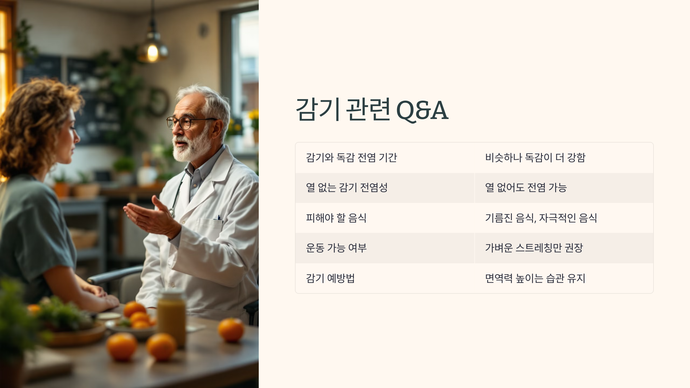 - 건강한 식단 유지: 비타민 C와 같은 면역력 강화에 도움이 되는 음식을 섭취해 감기 증상 완화에 도움이 되도록 합니다.