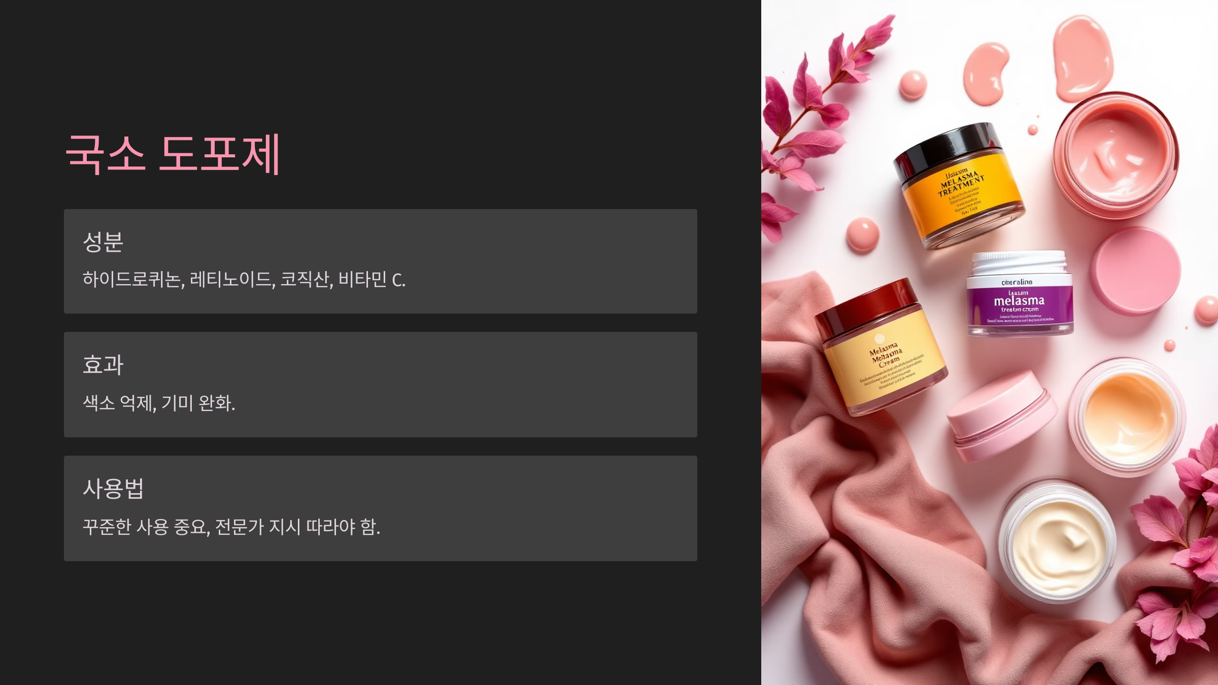 국소 도포제는 피부에 직접 바르는 제품으로, 주로 하이드로퀴논, 레티노이드, 코직산, 비타민 C 등이 포함된 크림이 사용됩니다. 이 성분들은 색소를 억제하고 기미를 완화하는 데 도움을 줍니다. 꾸준한 사용이 중요하며, 피부에 민감한 반응이 나타날 수 있으므로 전문가의 지시에 따라 사용하는 것이 좋습니다.