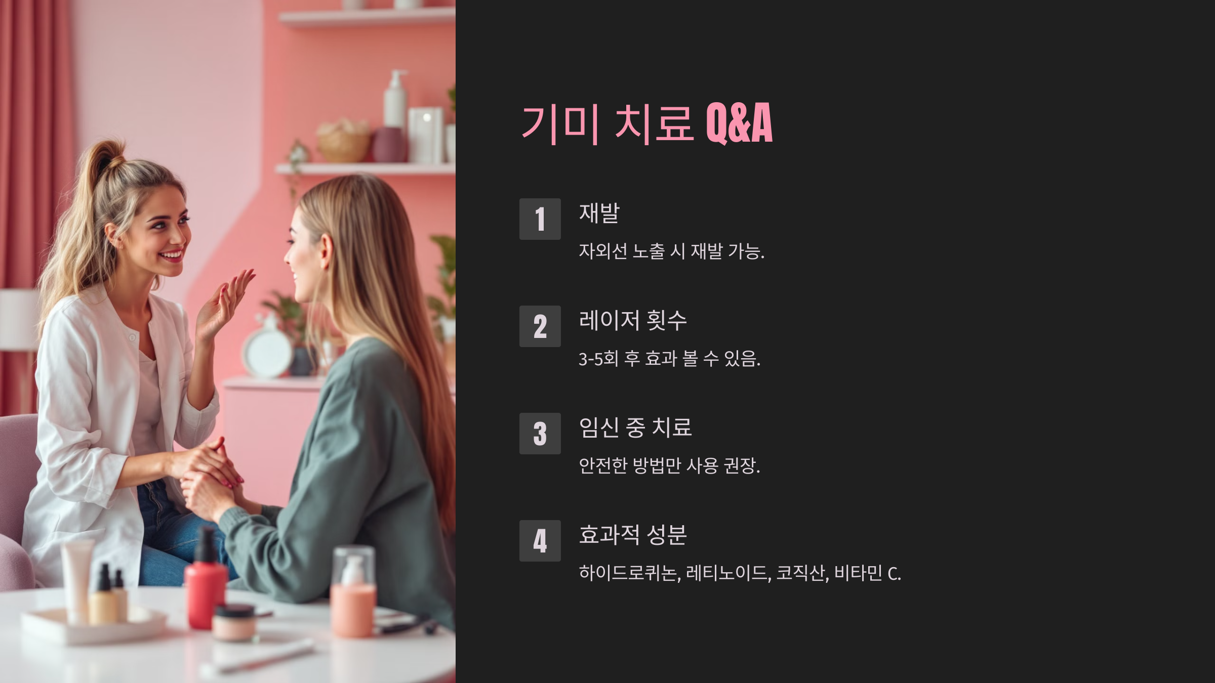- 장점: 기미 제거에 매우 효과적이며, 비교적 빠른 회복 가능.