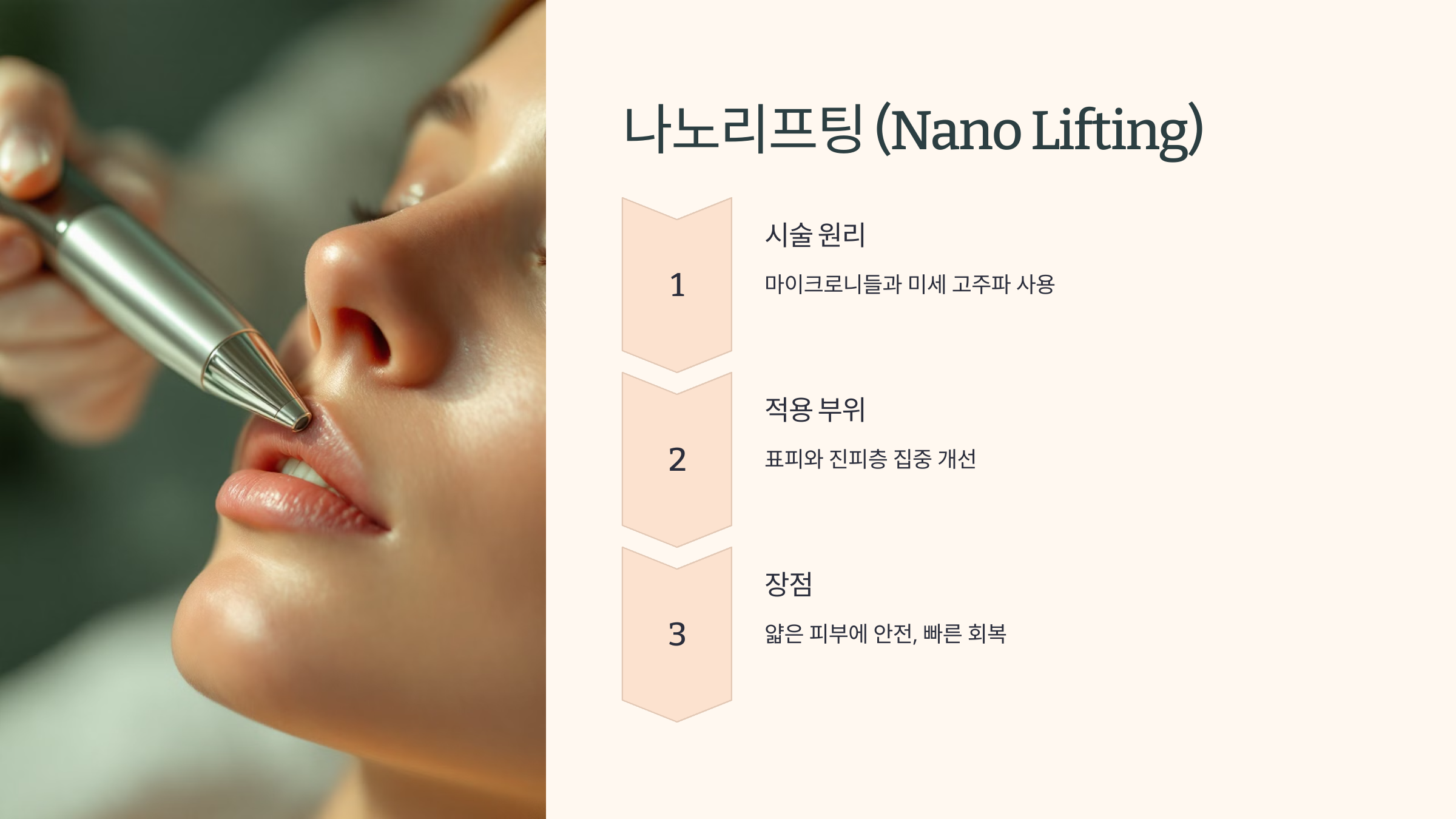 나노리프팅은 피부의 깊은 층에 자극을 주기보다는 표피와 진피층에 더욱 집중하여, 얇은 피부층에도 안전하게 사용할 수 있는 리프팅 기술입니다. 피부가 얇고 예민한 분들에게 매우 적합한 시술로, 결과가 비교적 빠르게 나타나는 장점이 있습니다.