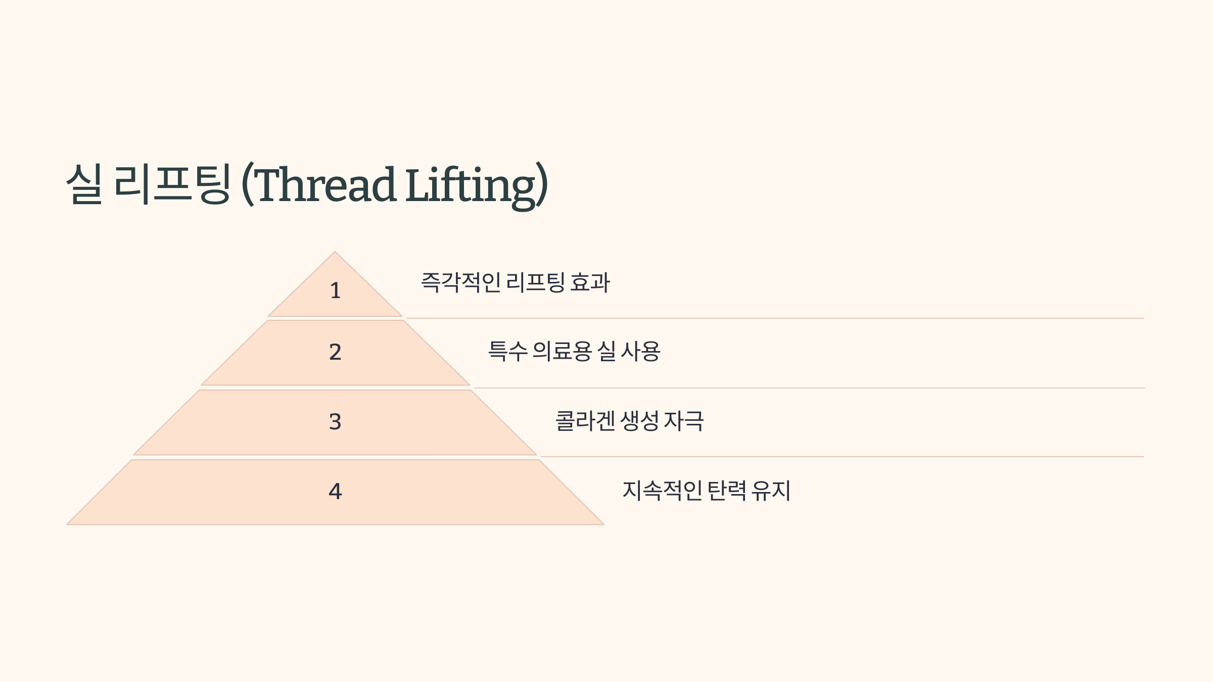 - 시술 원리: 특수한 의료용 실을 피부에 삽입해 실을 당기며 리프팅 효과를 줍니다. 이 실이 녹아가며 콜라겐이 활성화돼, 탄력 있는 피부를 유지하게 됩니다.