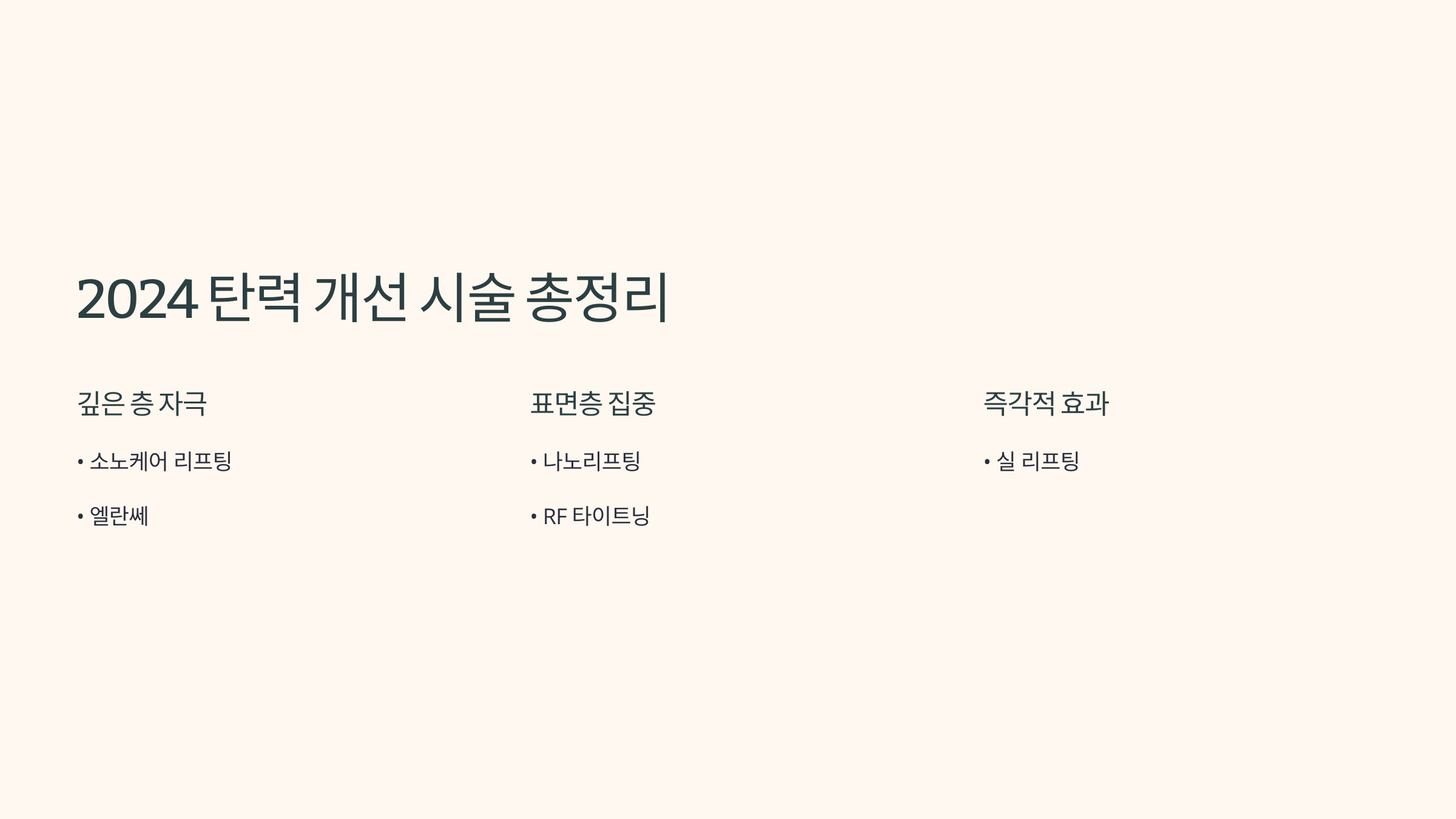 2024년의 최신 시술 트렌드는 피부와 근막층을 더욱 깊고 정밀하게 자극해 자연스러운 탄력을 유지할 수 있게 하는 데 중점을 두고 있습니다. 근막층에 효과적인 소노케어 리프팅과 엘란쎄, 표피와 진피를 강화하는 나노리프팅, 고주파와 실 리프팅 같은 최신 시술은 각자 피부 상태에 따라 적합한 방법이 다를 수 있습니다. 저는 개인적으로 피부가 얇아 비교적 부드러운 나노리프팅과 RF 타이트닝을 고려하고 있으며, 단기간 효과를 원하신다면 실 리프팅도 좋은 선택일 것입니다. 자신의 피부 상태에 맞는 최신 시술로, 더 건강하고 탄력 있는 피부를 유지해 보세요.